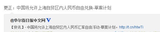 消息称中国将允许上海自贸区内人民币自由兑换 2013-09-05 14:53 我要评论 调整字体 (证券时报网)据华尔街日报中文网9月5日在微博上透露,中国将允许上海自贸区内人民币汇率自由浮动,随后华尔街日报中文网更正为中国将允许上海自贸区内人民币自由兑换。 责编:牛甜