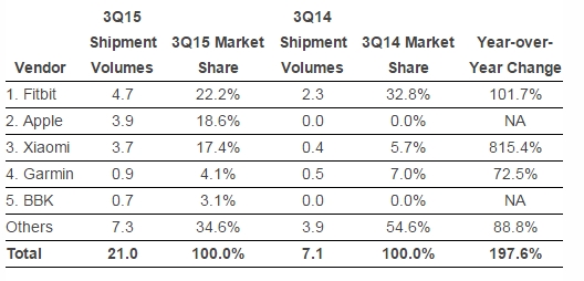 苹果今年已经成为全球第二大可穿戴设备制造商,以390万个的出货量拿下18.6%的份额。Fitbit依然位居行业首位,出货量从230万个增长到470万个,但市场份额被苹果夺走了一部分。