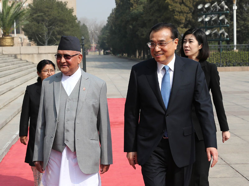 国务院总理李克强21日上午在人民大会堂同来华进行正式访问并将出席博鳌亚洲论坛2016年年会的尼泊尔总理奥利举行会谈。